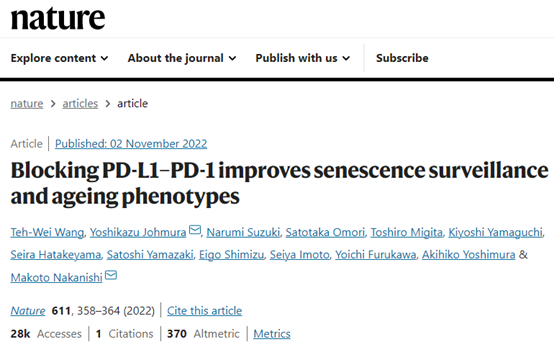 [1]Wang TW,Johmura Y, Suzuki N, et al. Blocking PD-L1-PD-1 improves senescencesurveillance and ageing phenotypes. Nature. 2022 Nov;611(7935):358-364. doi:10.1038/s41586-022-05388-4. Epub 2022 Nov 2. PMID: 36323784.