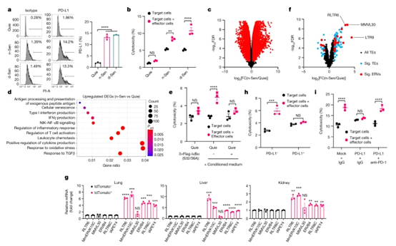 接下来,研究人员检查了PD-L1是否在细胞衰老过程中充当针对T细胞免疫的免疫检查点。通过体外T细胞杀伤实验,他们发现活化的T细胞显著诱导针对PD-L1阴性衰老细胞的细胞毒性,但不针对PD-L1阳性衰老细胞,表明衰老细胞中PD-L1的表达是其逃避T细胞免疫所必需的。