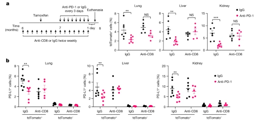 结果显示,注射抗PD-1的小鼠的肺、肝和肾中的tdTomato+细胞群数量明显低于对照组;抗PD-1治疗减少了tdTomato+细胞中PD-L1阳性细胞数量,但并没有减少tdTomato-细胞中PD-L1阳性细胞数量,表明细胞毒性T细胞参与了细胞衰老的免疫监视。