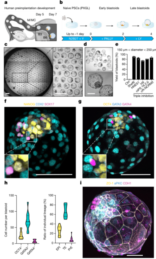 在4 dpf时,孕体形成桑葚胚,启动空化形成囊胚。囊胚发育(5-7 dpf)支持三个创始谱系的产生:外胚层(EPI),它是胚胎的;滋养外胚层(TE),是胚外的;和原始内胚层 (PrE),它是胚外的(图1a)。外周细胞通过抑制Hippo 通路变成TE。在PXGL2中培养的原始人多能干细胞(PSC)在抑制TGFβ和ERK通路后有效地形成TE类似物。该团队在非粘附水凝胶微孔中聚集初始PSC并抑制这三种途径(图1b)。在含有STAT激活剂白血病抑制因子(LIF)和Y-27632(一种 ROCK 抑制剂),囊胚样结构有效形成(图1c-e)。