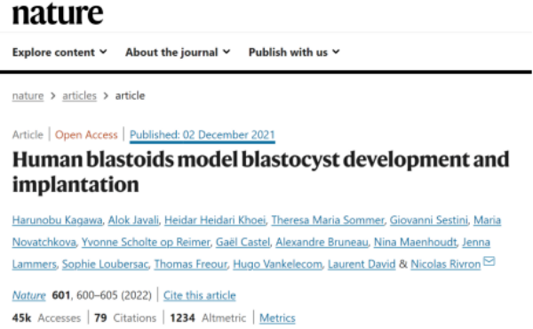 相关研究成果以“Generating human blastoids modeling blastocyst-stage embryos and implantation”为题于2023年2月15日发表在Nature Protocols上。