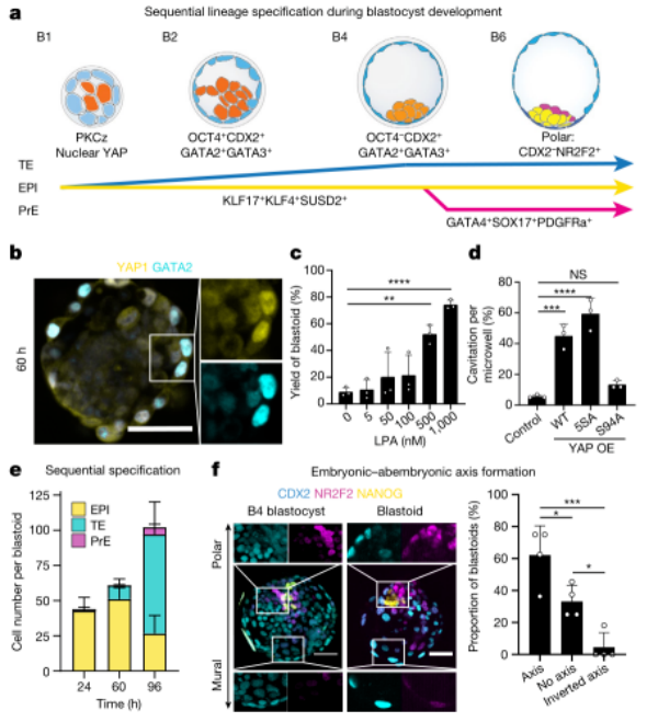 关于人类囊胚谱系分离的知识是有限的(图3a)。然而,已知在获得顶端结构域后外周细胞中会发生Hippo通路的抑制,并且需要启动TE规范。因而作者测试了囊胚样结构是否采用了这种机制。值得注意的是,aPKC和F-肌动蛋白表达域在外部细胞中似乎是共同排列的,这些细胞也在细胞核中积累了Hippo下游效应子YAP1。YAP1核位置与GATA2和GATA3表达相关,与NANOG表达形成对比,并且仅限于TE类似物(图3b)。aPKC抑制剂可以抑制Hippo通路的LPA受体配体(LPA和NAEPA)增强了囊胚样结构的形成(图3c)。由于Hippo通路抑制释放YAP1进入细胞核,作者测试了YAP1的基因工程水平和功能是否会影响形态发生。YAP1 (5SA)的野生型或组成型活性形式的过表达加速了空化(图3d)。