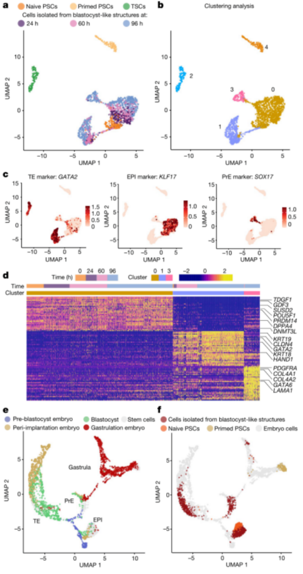 单细胞转录组学分析表明,胚泡样结构仅形成三种不同的转录组状态(图2a、b),由三个创始谱系特有的基因标记,包括GATA2和GATA3 (TE)、POU5F1和KLF17 (EPI),以及GATA4 和SOX17 (PrE)(图2c、d)。与来自胚泡、体外培养的胚泡和原肠胚形成期胚胎的细胞比较表明,胚泡样结构中的细胞在转录上与胚泡期相似并且不同于着床后阶段(图2e、f)。