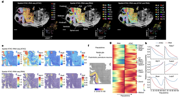 对小鼠胚胎(E13)进行Spatial ATAC–RNA-seq分析(图2),通过表观遗传组和转录组数据均能成功分辨小鼠胚胎各个器官。为了研究胚胎发育中染色质可及性和基因表达之间的时空关系,研究分析了从radial glia到postmitotic premature neurons的分化轨迹。表明spatial-ATAC-RNA-seq 技术可用于解析组织发育过程中的基因调控机制和时空动态。