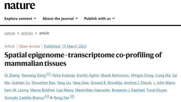 2023年3月15日,耶鲁大学樊荣教授团队和卡罗林斯卡学院Gonçalo Castelo-Branco教授团队合作,在Nature期刊发表了题为:Spatial epigenome–transcriptome co-profiling of mammalian tissues的研究论文。
