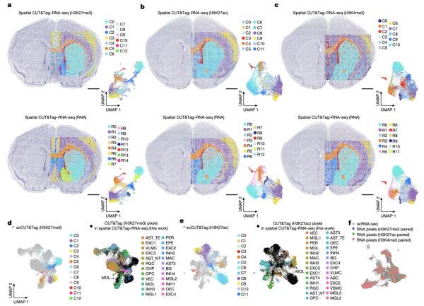 对产后22天小鼠大脑进行Spatial ATAC–RNA-seq和Spatial CUT&Tag–RNA-seq分析,通过提高编码数量到100,实现对几乎整个小鼠半脑的空间表观遗传组和转录组共同分析(图3)。通过联合分析发现在某些小鼠大脑组织区域中,某些基因的表观遗传特征随着发育而持续存在,但基因表达却不同。联合分析结果还发现,表观遗传调控与基因表达在幼鼠大脑不同区域中存在预期之外的相互关系,并且不同表观遗传特征可以通过相互合作来调控基因表达。
