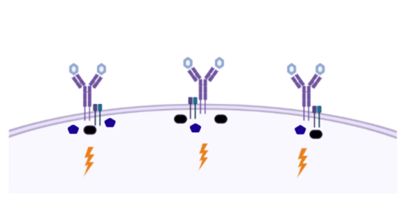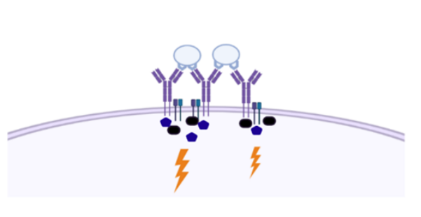 图2 受体激活的经典模型。抗原(浅蓝色)与多个BCR(紫色)结合,信号分子(深蓝色和黑色)因此能够聚集,并将信号(闪电符号)发送到细胞内。(图源:[2])