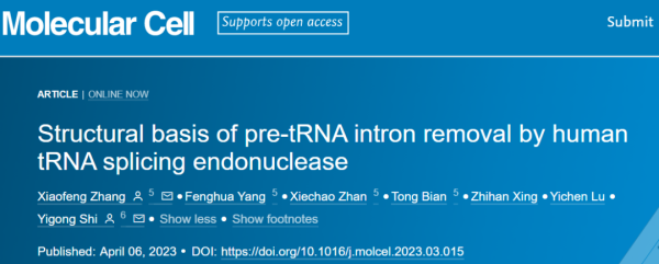 2023年4月6日,西湖大学施一公团队在Molecular Cell(IF=19)在线发表题为“Structural basis of pre-tRNA intron removal by human tRNA splicing endonuclease”的研究论文,该研究揭示了人tRNA剪接核酸内切酶去除tRNA前体内含子的结构基础。该研究报道了人TSEN在催化前和催化后的平均分辨率分别为2.94和2.88 Å下与全长pre-tRNA结合的冷冻电镜结构。