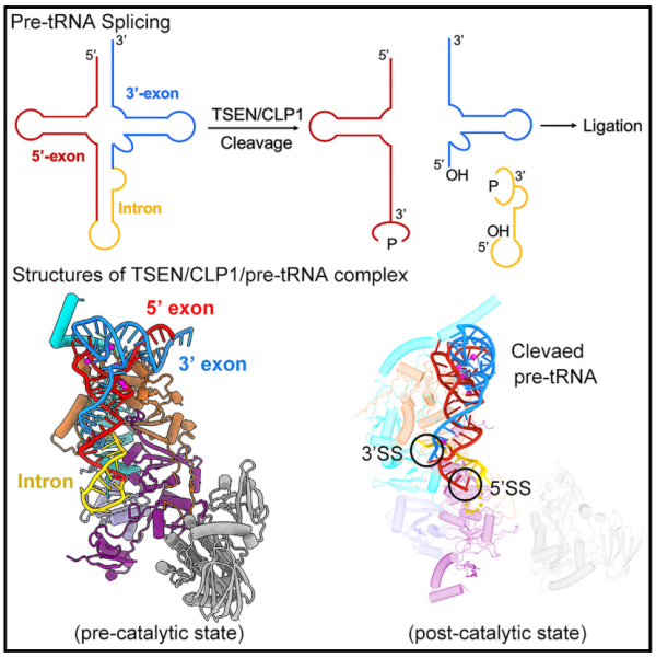 自从20世纪70年代发现tRNA内含子以来,广泛的生化和晶体学研究中对各种类型的TSENs的pre-tRNA裂解有了相当大的了解。特别地,古生菌TSEN与隆起-螺旋-隆起(BHB) RNA基序复合物的结构揭示了一些关键的相互作用,这些相互作用是pre-tRNA识别和切割所必需的。然而,关于真核生物TSEN的结构信息出现缓慢,严重限制了对pre-tRNA裂解机制的理解。例如,TSEN被认为采用分子尺机制来识别pre-tRNA的两位点切割,但由于缺乏被TSEN结合的全长pre-tRNA的结构信息,其基础仍不充分。此外,四个TSEN亚基是如何被组织成一个完整的、具有两个独立活性位点的内切酶的仍不清楚。