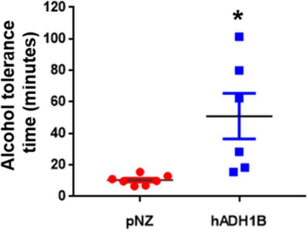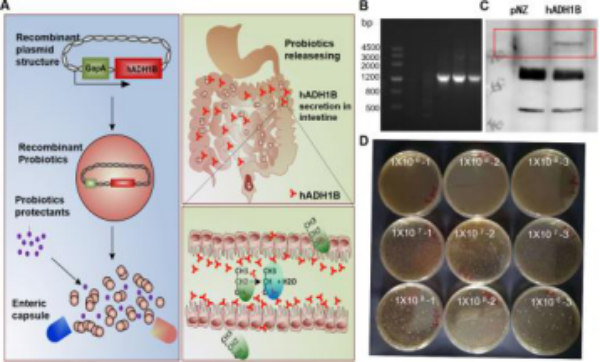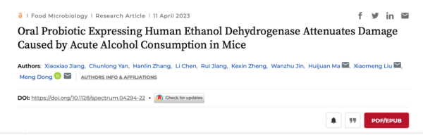 2023 年 4 月 11 日,国内的中国科学院动物研究所、河北医科大学和河南新乡医学院等研究人员联合在Microbiology Spectrum发表题为Oral Probiotic Expressing Human Ethanol Dehydrogenase Attenuates Damage Caused by Acute Alcohol Consumption in Mice的研究。研究团队设计出了一种表达hADH1B 的重组益生菌,该益生菌可帮助小鼠减少酒精吸收,延长酒精耐受时间及缩短急性饮酒后的恢复时间。更重要的是,该益生菌还可保护肝脏和肠道免受酒精刺激引起的急性损伤。