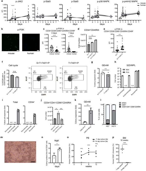 当这些作者将这种方法应用于人类造血干细胞时,他们注意到它们的增殖能力不如小鼠造血干细胞强。经过分子分析,他们观察到称为PI3K和AKT的重要信号分子的活性下降。为了解决这个问题,他们发现加入激活PI3K和AKT的化学物可以明显改善人类造血干细胞的生长。