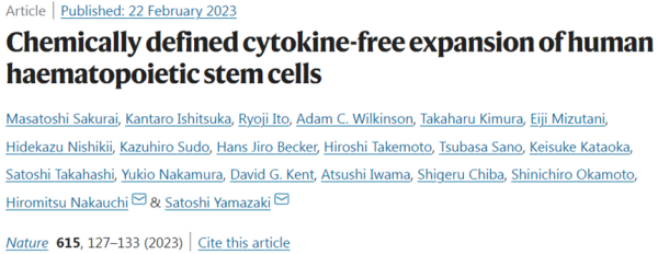 如今,在一项新的研究中,来自日本筑波大学、东京大学和庆应义塾大学等研究机构的研究人员建立了一种支持造血干细胞在体外长期扩增的新型培养系统。相关研究结果发表在2023年3月2日的Nature期刊上,论文标题为“Chemically defined cytokine-free expansion of human haematopoietic stem cells”。