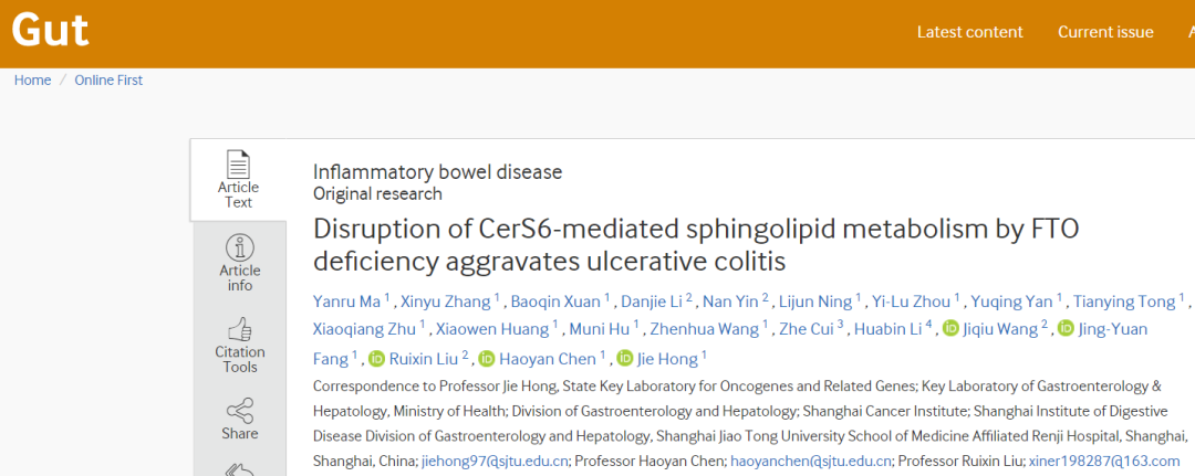 2023年9月21日,上海交通大学洪洁、陈豪燕及刘瑞欣共同通讯在Gut(IF=25)在线发表题为“Disruption of CerS6-mediated sphingolipid metabolism by FTO deficiency aggravates ulcerative colitis”的研究论文,该研究发现FTO缺乏破坏CerS6介导的鞘脂代谢可加重溃疡性结肠炎。该研究在UC患者的内部队列和外部队列中发现了FTO下调。DSS处理下,Ftoflox/ flox;Villin-cre小鼠肠道菌群失调,促炎巨噬细胞浸润增加,Th17细胞分化增强。