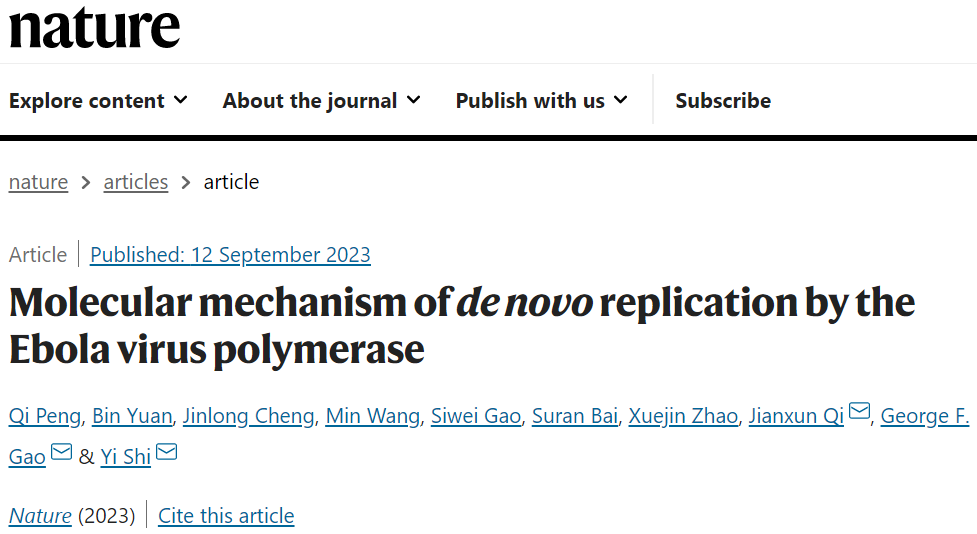 2023年9月12日,中国科学院微生物研究所施一、高福及齐建勋共同通讯在Nature 在线发表题为“Molecular mechanism of de novo replication by the Ebola virus polymerase”的研究论文,该研究揭示了埃博拉病毒聚合酶从头复制的分子机制。该研究以EBOV L聚合酶为代表,在酶促实验中发现,L聚合酶的novo复制受EBOV基因组特异性3′先导序列控制,至少3个碱基可以有效地驱动RNA合成的延伸过程,而不依赖于特异性RNA序列。