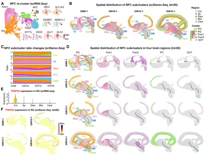 为进一步了解神经前体细胞(NPC)的独特功能,将NPC重新聚为5个亚型并可视化不同时期不同脑区的时空分布特点。在GW8所有脑区、GW10-16部分脑区,表现出明显的脑室区/室下区(VZ/SVZ)分布,同时揭示了不同脑区不同NPC亚型的分子多样性。其中放射状胶质细胞(RG)最先出现,且在该阶段表现出明显的区域异质性;TFAP2C的缺失会影响人Cor RG的形成,其特异性在人大脑皮层RG中表达并成为决定大脑RG细胞的命运的关键转录因子。