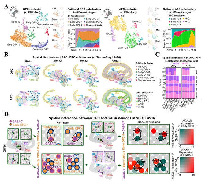 研究者进一步将GW6-GW23不同脑区的少突胶质细胞前体细胞(OPC)和星形胶质细胞前体细胞(APC)进行亚群细分,通过比较分析发现它们的区域异质性相对较小,但是,进一步观察发现这些亚型存在显著的空间分布偏好。Dien中OPC亚型与GABA能神经元之间的细胞通讯多发生在Dien腹侧,而这些相互作用可能促进了GABA能神经元的发育和成熟。而这些空间偏好性的分布有助于促进神经元区域特化。