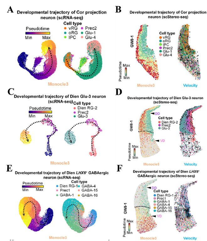 研究者计算并重建了每个区域特定神经元亚群的时空发育轨迹。Cor RG分化为IPC和Prec2,并最终发展为谷氨酸能神经元。Dien RG-1趋向于向LHX6+ GABA能神经元发育,而Dien RG-2趋向于向谷氨酸能神经元发展。Dien RG-1和LHX6+ GABA能神经元主要位于Dien腹侧,而Dien RG-2和Dien谷氨酸能神经元主要位于Dien背侧。这将有助于更好地理解异质性RG细胞如何对神经元的区域特化做出贡献。