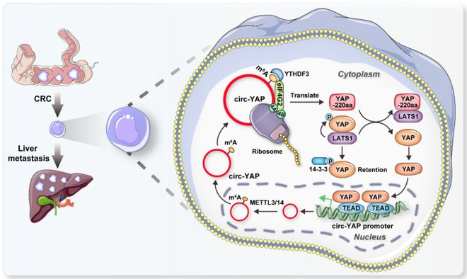 从机制上讲,circ-YAP编码了一种含有220个氨基酸的新型截断蛋白,称为YAP-220aa,该蛋白与LATS1竞争性结合,导致YAP去磷酸化和核易位,从而激活一系列促进转移的基因。重要的是,N6-甲基腺苷(m6 A)修饰协调了circ-YAP翻译的有效起始,需要m6 A“读取器”YTHDF3和eIF4G2翻译起始复合物。有趣的是,circ-YAP被YAP/TEAD复合物转录增强,从而形成一个正调控前馈回路。总之,该研究揭示了circ-YAP编码的一个以前未被表征的癌蛋白,这意味着一个有希望的结直肠癌肝转移患者的生物标志物和治疗靶点。