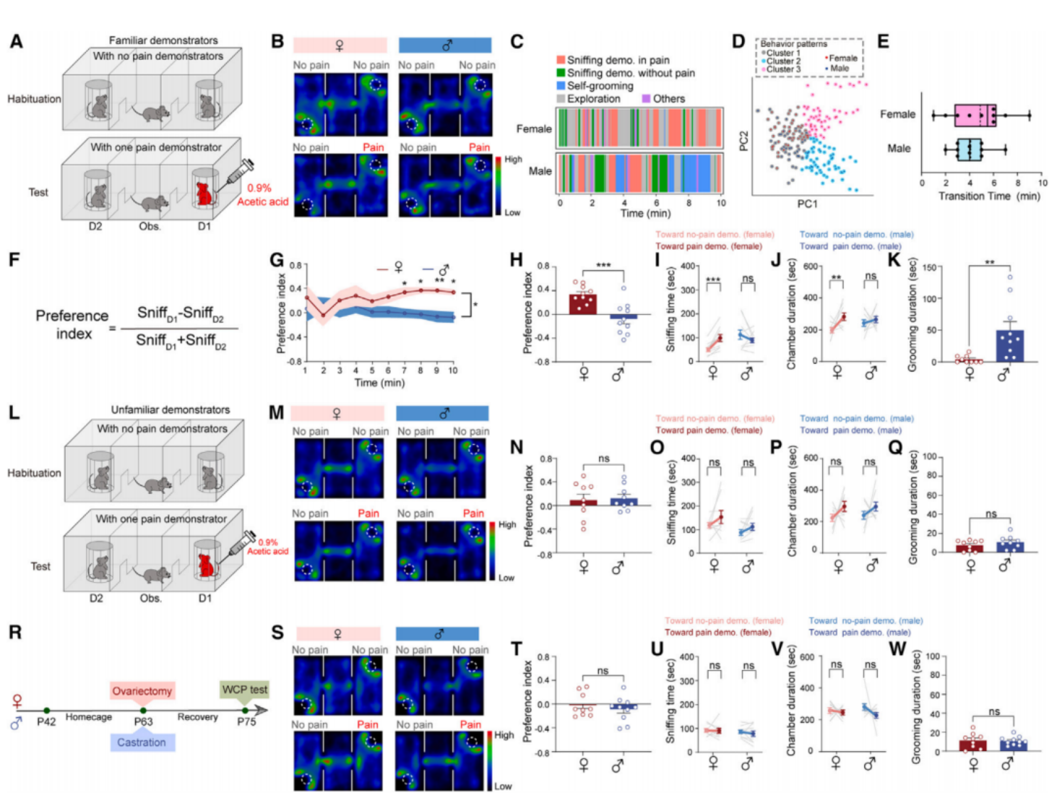 DOI://doi.org/10.1016/j.neuron.2024.02.001为了分析雄鼠和雌鼠的共情表现,研究者设计了一个让它们分别目睹同伴经历疼痛的测试(WCP)。在WCP测试中,两只年龄和性别匹配的小鼠被放在同一房间内,其中一只被注射了醋酸从而诱导其经历疼痛,而另一只则作为观察者。有意思的是,研究者观察到:在测试的前5分钟,雌性/雄性小鼠均表现出探索行为,并与“正处于疼痛中”的同伴产生一定互动。但5分钟之后,雌性和雄性小鼠则表现出了不同的行为特征。雌性小鼠会对疼痛的同伴产生更多的社交接近和嗅探行为,并在房间里停留更长的时间;而雄性小鼠则表现出渐进式和高水平的自我梳理行为,而非社交偏好。也就是说,当目睹同伴经历痛苦时,雄性和雌性小鼠出现了明显的共情差异——雌性会持续和同伴互动,而雄性则更多地focus在自己身上。