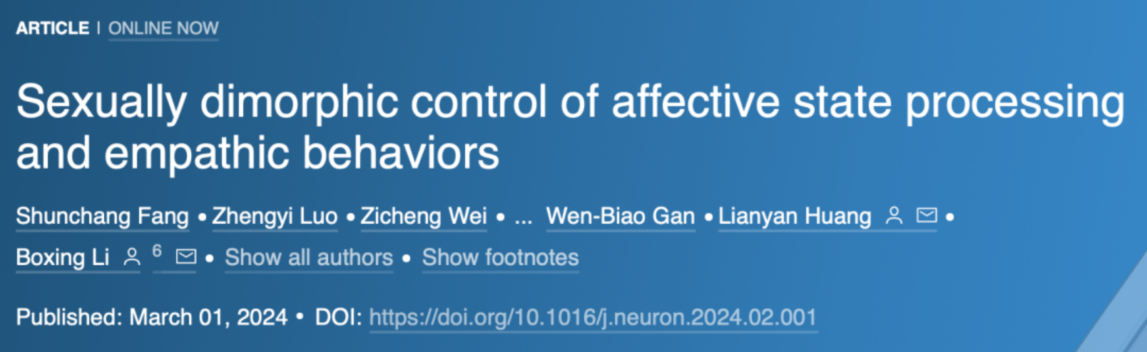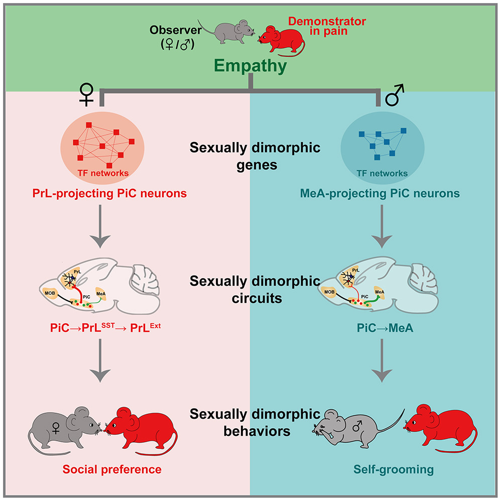 男女性在看到喜欢/讨厌人受伤时的大脑表现看来“太直男”的话语或行为真不是演的。但为什么会出现两性共情能力的差异呢?近日,来自中山大学脑功能与疾病重点实验室的研究团队从大脑中神经回路中找到了答案,揭示了“为什么男女之间的共情能力不同”。该研究发表在Cell子刊Neuron上。研究发现,对于其他“鼠”的痛苦,雌性和雄性小鼠会发出不同的嗅觉暗示,而这些暗示物会进一步激活梨状皮层(PiC)中不同的神经回路,唤起观察“鼠”的性别两态性移情行为,即不同的性别会表现出不同的移情行为——雌性会表现出更强的社会偏好,而雄性则会过度地自我梳理。