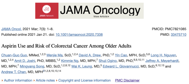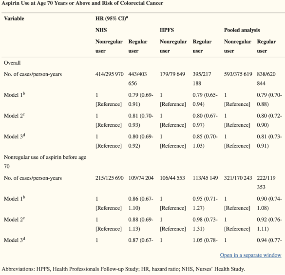 研究者从护士健康研究(NHS)和卫生专业人员随访研究(HPFS)两个大型前瞻性队列中收集到94540名70岁及以上的参与者。在28-34年的随访期间,累计记录到1431例结直肠癌(CRC)病例,包括857名来自NHS队列的女性和574名来自HPFS的男性。在70岁及以上的人群中,每周使用≥2次阿司匹林的参与者罹患CRC的风险降低了20%。不过,这种负相关性仅存在于70岁之前就定期使用阿司匹林的人群中,但在70岁及以后才定期使用阿司匹林与CRC风险降低无关。