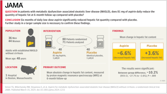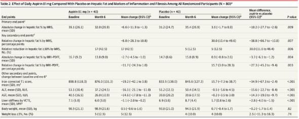 doi:10.1001/jamanetworkopen.2024.10021研究者开展了一项为期6个月的随机、双盲、安慰剂对照临床试验,涵盖年龄在18-70岁之间、罹患代谢功能障碍相关脂肪性肝病(MASLD)但没有肝硬化的80名患者。按照随机的原则,80名参与者被随机分配到阿司匹林组(n=40,即每天收到81mg的阿司匹林药片)和对照组(n=40,即每天收到相同剂量的安慰剂)进行治疗。在基线时,全部参与者的体重指数为33.7,核磁共振波谱分析检查(MRS)检测得到的平均肝脏脂肪率为35.2%。但在经过6个月治疗之后,与安慰剂组相比,每天服用81mg的阿司匹林治疗显著降低了绝对肝脏脂肪率;两组间的平均差异为10.2%。次要结果显示,服用阿司匹林之后,有42.5%患者的肝脏脂肪量降低了30%以上,而该比例在安慰剂组中仅为12.5%。