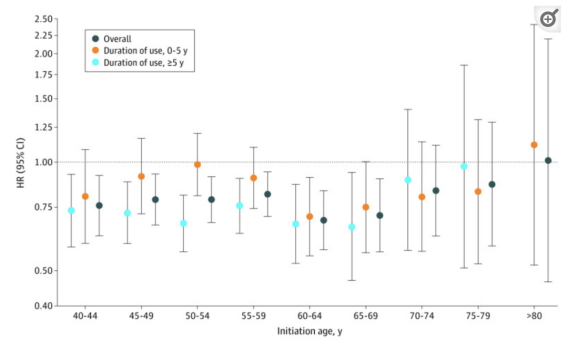 70岁及以上人群使用阿司匹林与CRC风险之间的关系为了确定阿司匹林使用年限与CRC风险之间的关系,研究者进一步对70岁以前就定期使用阿司匹林的参与者进行分组。结果发现,在70岁前至少5年坚持服用阿司匹林,与CRC风险显著降低有关。举例来说,NHS队列数据显示,与不规律使用的相比,从40-69岁期间就开始规律使用阿司匹林的女性,罹患CRC风险显著降低了21-31%。研究者表示,这也与之前大量研究证实的“阿司匹林对CRC的好处至少需要5-10年的使用”相一致。相比之下,开始服用阿司匹林的年龄越大,从中获得的健康益处越小。具体而言,70-74岁开始定期使用阿司匹林,相应的罹患CRC风险降低17%;如果到了75-79岁,风险降低13%;但到了80岁及以上,则无法观测到风险差异。