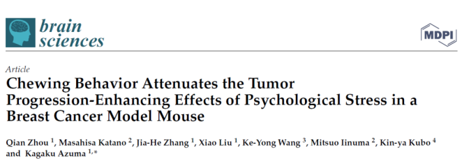 一般来说,心理压力会加速肿瘤生长。为了研究咀嚼行为如何在心理压力下影响肿瘤生长,研究团队使用植入了人类乳腺癌细胞(MDA-MB-231)的无胸腺裸鼠进行了实验。这些小鼠被分为三组:对照组、压力组和压力+咀嚼组。压力组在细胞接种后的35天内,每天三次被关在透明的圆筒中,每次45分钟,以施加心理压力。而压力+咀嚼组在承受压力时会被提供一根木棍来咀嚼。结果研究人员惊奇地发现,咀嚼行为可以抑制心理压力对肿瘤生长的刺激作用,具有显著的抑制作用。与压力组相比,压力+咀嚼组的小鼠在肿瘤血管生成和肿瘤细胞增殖方面表现出抑制的效果。这些发现得到了免疫组织化学和蛋白质印迹分析的支持。进一步的研究发现,在心理压力下咀嚼可以降低应激激素的水平,特别是糖皮质激素,并减少肿瘤中糖皮质激素和β2-肾上腺素能受体的表达。此外,咀嚼还与氧化应激相关的诱导型一氧化氮合酶和4-羟基壬烯醛的表达减少有关,同时抗氧化酶超氧化物歧化酶2的表达增加。这些发现表明,咀嚼行为可能通过调节应激激素水平及其受体,以及随后涉及活性氧和氮物质的信号传导途径,来减轻心理压力对乳腺癌进展的促进作用。
