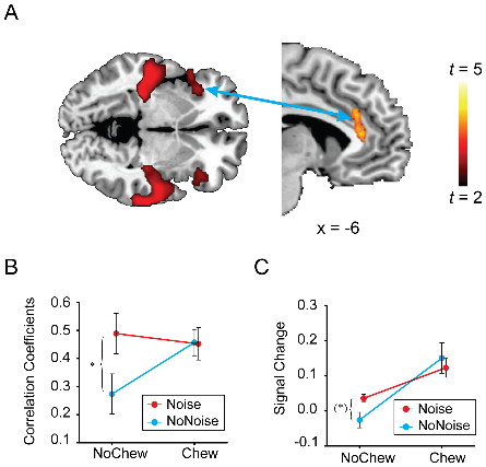 在实验中,研究人员利用功能磁共振成像技术fMRI技术,观察被试者在强烈的噪音干扰下的反应。同时,研究人员要求参与者在嚼口香糖和不嚼口香糖的情况下评估自己的压力水平。结果显示,当参与者同时嚼口香糖时,他们报告的压力感较低。在fMRI中,他们发现了参与压力处理的大脑区域。当参与者暴露在噪音中时,双侧颞上沟(STS)和左侧前岛叶(AI)被激活,这些区域的激活水平与自我报告的压力水平相关。然而,嚼口香糖显著降低了这些区域的激活水平,表明嚼口香糖对应激源的感觉处理具有抑制作用。