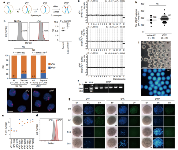 本颠覆性实验的起点是雄性小鼠的多能干细胞(PS细胞),这些细胞具有变成体内任何类型细胞的潜力。然而,由于它们携带的是XY性染色体,按照自然界的规律,这些细胞无法发育成卵母细胞。但是,科学家们通过一系列精细的操作,改变了这些细胞的染色体组成,将它们从XY转变为XX,从而模拟了雌性细胞的特征。那他们究竟做了些什么?首先,科学家们使用了CRISPR-Cas9基因编辑技术,这是一种实现在基因组中精确剪切和插入的工具。通过CRISPR-Cas9系统在小鼠胚胎干细胞(ES cells)中敲入DsRed(一种红色荧光蛋白)至X染色体,以监测X染色体的数量。由于干细胞长期培养过程中会发生染色体改变,大约6% 的胚胎干细胞会自发失去Y染色体。因此,自然培养后通过筛选,研究人员成功获取了丢失Y染色体的ES细胞,生成了XO型的ES细胞。随后,研究人员使用逆转纺锤体组装检查点抑制剂处理XO型ES细胞,对它们继续培养获得X染色体复制的ES细胞。为了验证生成的XX ES细胞的基因完整性,研究人员通过荧光激活细胞排序和荧光原位杂交等方法,确认了X染色体的复制,从而产生了XX型的ES细胞。