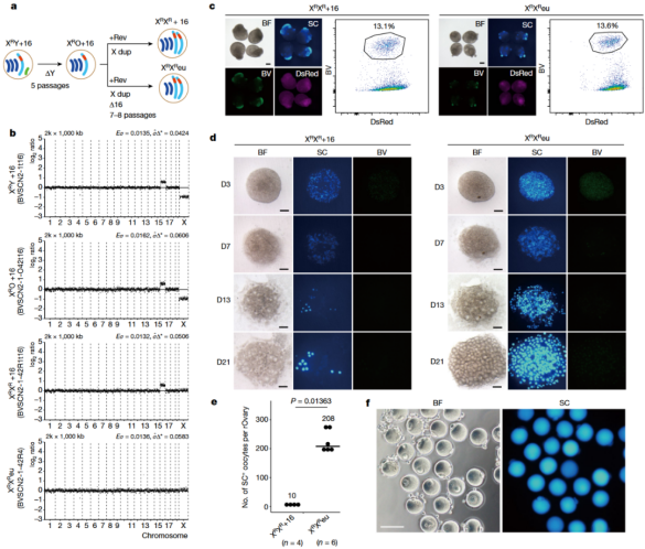 接下来,性转换后的XX型ES细胞被诱导分化为原始生殖细胞样细胞(PGCL cells),随后与雌性胚胎日12.5天的生殖腺体细胞聚集,并在体外分化(IVDi)培养条件下培养。在这个系统中,细胞开始分化,逐渐转变为能够产生卵母细胞的前体细胞。这个过程就像是在细胞的一生中按下了“重置”按钮,让它们重新获得了发育成卵母细胞的能力。实验结果发现,重建后的XX型胚胎干细胞产生的卵母细胞的数目明显大于来自亲代XY和XO型胚胎干细胞产生的卵母,并且这些体外培养的卵母细胞在很多方面都与自然状态下的卵母细胞相似。