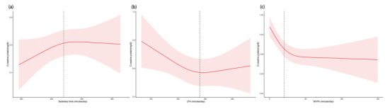 图2:久坐时间(A)、LPA(B)、MVPA(C)和C反应蛋白之间的量效关系