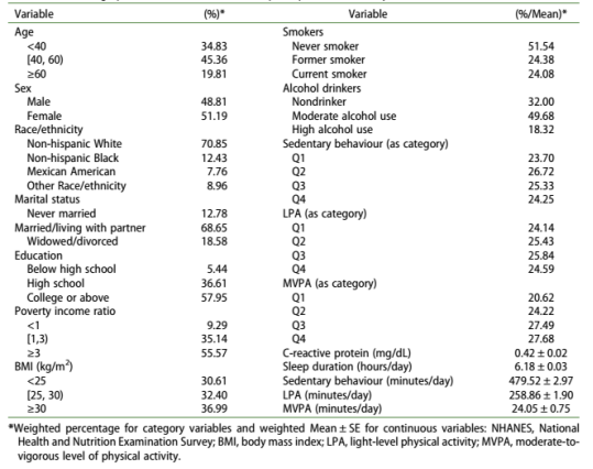 本研究中所有参与者的平均睡眠时间为6.2h,CRP的平均水平为0.42±0.02 mg/dL,平均每天久坐时间为479.52±2.97min。