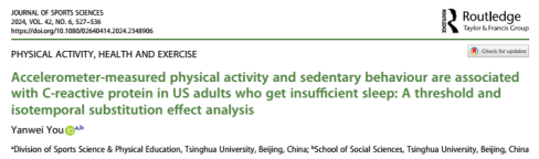 这不就来了!近期,来自清华大学的研究人员在Journal of Sports Sciences杂志上发布了题为“Accelerometer-measured physical activity and sedentary behaviour are associated with C-reactive protein in US adults who get insufficient sleep: A threshold and isotemporal substitution effect analysis”的研究结果[1]。研究表明:适度的中等到剧烈的体力活动(MVPA)(20分钟左右)对减轻睡眠不足引发的炎症有缓解作用。