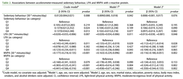 研究利用加权回归模型、两段线性回归模型等统计方法,来评估:中等到剧烈的体力活动(MVPA)、轻度体力活动(LPA)、久坐行为与慢性炎症(CRP)之间的关联。此外,研究人员还应用了等时替代模型来模拟用MVPA或LPA来缓解睡眠不足、久坐对CRP水平的影响,并且进行了量效分析,旨在发现降低CRP水平的物理活动强度阈值。