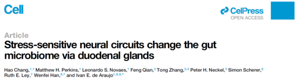 1. Chang H, Perkins MH, Novaes LS, Qian F, Zhang T, Neckel PH, Scherer S, Ley RE, Han W, de Araujo IE. Stress-sensitive neural circuits change the gut microbiome via duodenal glands. Cell. 2024 Aug 1:S0092-8674(24)00779-7. doi: 10.1016/j.cell.2024.07.019.