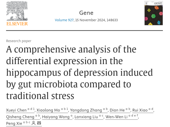 3. Chen X, Mo X, Zhang Y, He D, Xiao R, Cheng Q, Wang H, Liu L, Li WW, Xie P. A comprehensive analysis of the differential expression in the hippocampus of depression induced by gut microbiota compared to traditional stress. Gene. 2024 Nov 15;927:148633. doi: 10.1016/j.gene.2024.148633.