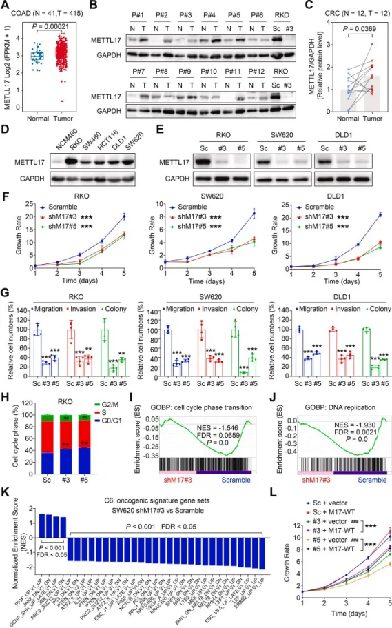作者敲低了三种CRC细胞系SW620、RKO和DLD1中的METTL17表达,发现敲减METTL17后,可以抑制结直肠癌细胞的增殖、迁移、侵袭。综上所述,这些结果强调了METTL17对CRC致癌活性的重要性。