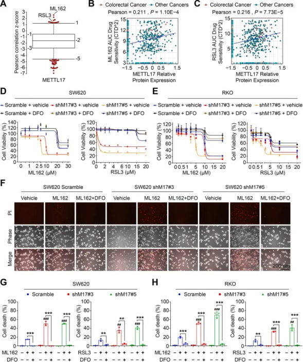 作者对METTL17进行敲减来探讨METTL17是否和铁死亡耐受有关,结果表明:METTL17敲减后,两种结直肠癌(CRC)细胞对铁死亡诱导剂ML162和RSL3引发的死亡更敏感,而铁螯合剂去铁胺(DFO)可以逆转这一过程;继而在METTL17敲低的CRC细胞中外源表达METTL17,发现可以部分挽救ML162诱导的铁死亡。