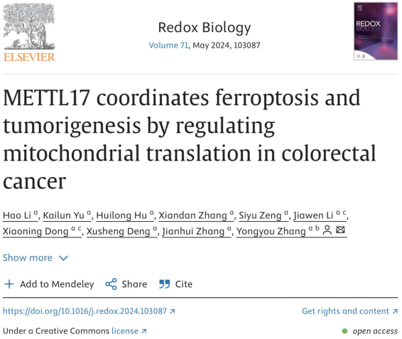 [1] Li, Hao et al. “METTL17 coordinates ferroptosis and tumorigenesis by regulating mitochondrial translation in colorectal cancer.” Redox biology vol. 71 (2024): 103087. doi:10.1016/j.redox.2024.103087