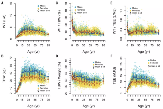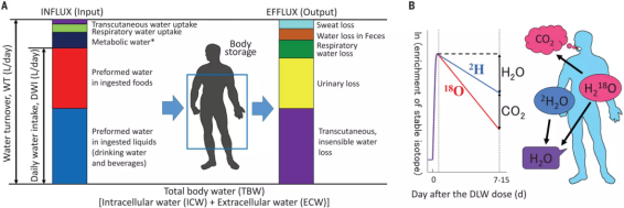 在开始研究前,需要先弄清楚一个概念:水周转率(Water turnover)。在人体内水并非静止,而是处于一种动态平衡的状态,比如人们每天会感到口渴、饥饿而主动饮水或摄食,但也会通过尿液、流汗、呼吸、粪便等多种方式将体液排出。水在人体内的总运动,包括摄入和损失,被称为水周转。因此,水周转率能够评估体内液体的周转(排泄)情况,被认为是计算每日所需饮水量的金标准。现有的测量水周转率的方法主要是氘法或双标记水(DLW)法,然而DLW方法相当昂贵,很难获得大规模数据。于是,在本研究中,研究者根据先前提出的水周转率预测方程来计算参与者的平均需水量。