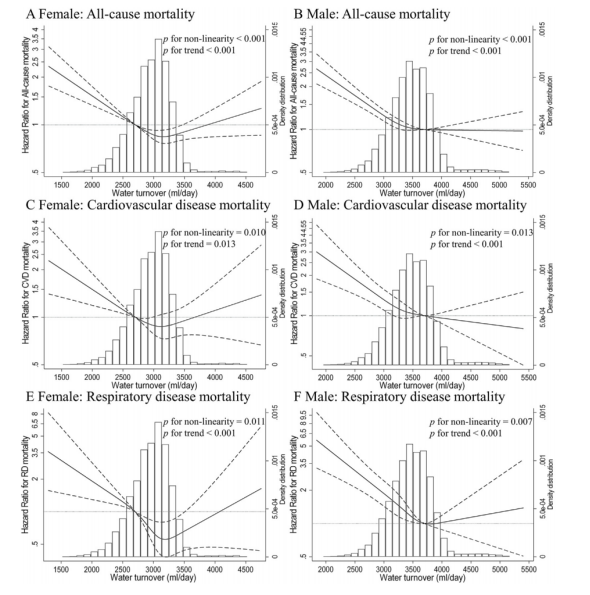 限制性立方样条计算得到的剂量-反应关系则更为直观——无论是在女性还是男性中,缺乏水分都与全因慢性死亡风险之间存在显著的“L”形关联;即可以简单理解为,身体内的水太少不好,太多也不好。当女性的每日水周转率保持在3000-3300mL/天时,全因死亡率达到最低值。男性中也存在类似情况,男性的每日水周转率在3500-3700mL/天时为最佳。