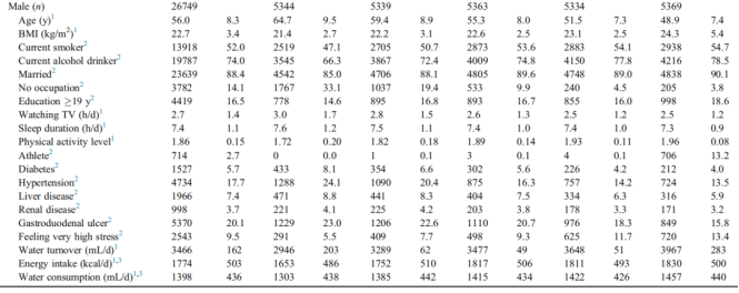 研究者从大型前瞻性的日本协作队列(JACC)中收集到63,488名参与者的数据,随访时间长达19.4年。基于上述计算公式得到每名参与者的水周转率,并根据该数值将人群分为性别特异性的五分位数。结果显示,女性的平均日水周转率为2950mL,男性为3466mL。基础信息显示,水周转率高的人往往更年轻,同时部分慢性病(如糖尿病和高血压)的发病率越低。具体来说,在女性参与者中,最高五分位的每日水周率转达到3378mL/天,比最低的2464mL/天高出了914mL;而相对来说,水周转率高的人每日饮水量也会更大,最高五分位的女性参与者平均每日饮水量达到1410mL,而最低的仅为1254mL。类似情况也出现在男性参与者中,最高五分位的每日水周转率达到3967mL/天,日均饮水量达到1457mL,但最低五分位的水周转率和饮水量分别为2946mL/天和1303mL/天。