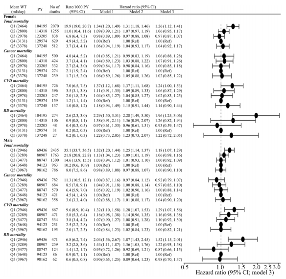 在中位19.4年的随访期间,累积记录到12,551人死亡。紧接着,研究者探究了水周转率与全因以及特定原因死亡率之间的关系,发现:对生活方式和病史进行调整之后,与Q4(第四个五分位数)的相比,水周转率位于最低五分位的女性参与者的全因死亡风险升高了26%,罹患心血管疾病和呼吸系统疾病导致死亡的风险分别升高了24%和96%。在男性中,水周转率最低五分位参与者的全因、心血管疾病和呼吸性疾病的死亡风险分别比Q4高出18%、29%和52%。