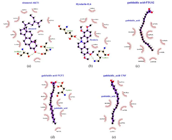 注:(a)谷甾醇-AKT1,(b)Hyndarin-IL6,(c)gadelaidic-FGF2,(d)gadelaidic-PTGS2,(e)gadelaidic-TNF
