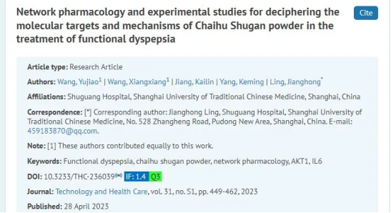 参考资料:Wang, Y., Wang, X., Jiang, K., Yang, K., & Ling, J. (2023). Network pharmacology and experimental studies for deciphering the molecular targets and mechanisms of Chaihu Shugan powder in the treatment of functional dyspepsia. Technology and health care : official journal of the European Society for Engineering and Medicine, 31(S1), 449–462. //doi.org/10.3233/THC-236039