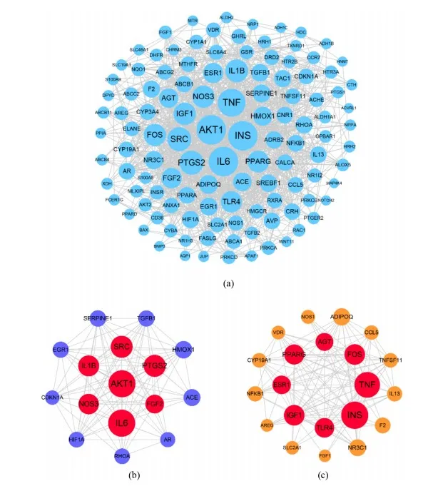 注:(a)使用Cytoscape软件分析来自STRING的PPI网络。MCODE用于分析(b)模块1和(c)模块2中PPI网络中的关键模块。