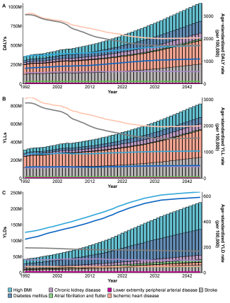 预测模型提示,2046年前预计缺血性心脏病和卒中的年龄标准化DALY和 YLL率预计将持续下降,而高BMI和糖尿病的YLD率会显著上升。若不采取有效防控措施,全球 CKM 相关疾病负担将持续加重,低SDI和中等SDI地区面临的形势更为严峻。