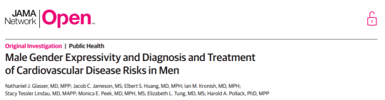 [1]Glasser NJ, Jameson JC, Huang ES, et al. Male Gender Expressivity and Diagnosis and Treatment of Cardiovascular Disease Risks in Men. JAMA Netw Open. 2024;7(10):e2441281. Published 2024 Oct 1. doi:10.1001/jamanetworkopen.2024.41281