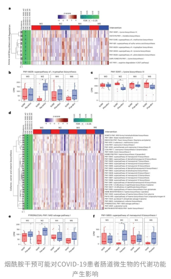 那这些菌群到底在“忙”些什么呢?研究人员进一步进行了宏基因组分析,结果发现,在干预第2周时,安慰剂组的菌群格外活跃:它们启动了合成色氨酸、苯丙氨酸、蛋氨酸、赖氨酸等关键氨基酸的路径,还动用了氧化还原和NAD⁺回收机制,像是在加班加点地支援宿主对抗病毒。这种“拼命三郎”般的工作状态,或许正是宿主体内NAD⁺不足所引发的“求援信号”,迫使肠道菌群投入更多资源“自救”。而在烟酰胺组,这种高强度应激反应并不明显,提示烟酰胺可能已经帮宿主缓解了部分压力,让菌群可以“从容不迫”地维持日常运作。